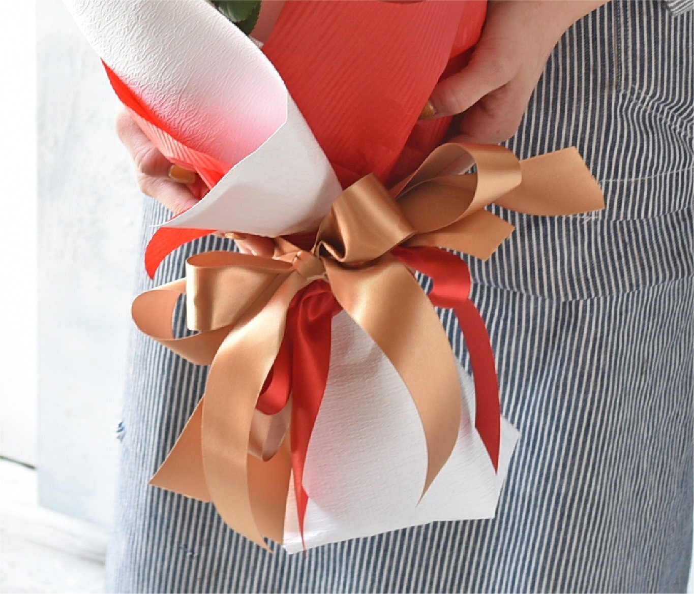 当店のご用意するバラの花束はサイズも大きく、ゆうパック、クロネコヤマトさんなどでお届けするダンボールには収まらないため、配達エリアを浜松市内(詳しくはトップページの配達エリアをご覧ください)とさせていただき、当店より直接お届けいたしますので、安心です。